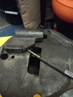 this pic shows where the split pin is locatedOnce the handle is removed it's time to separate the vice . You will need a hammer and nail punch , but you can use a strong nail . This is to release the worm screw which holds the two halves together . located between the bolt hole and slot you will see a approx 5mm pin that needs to be punched through